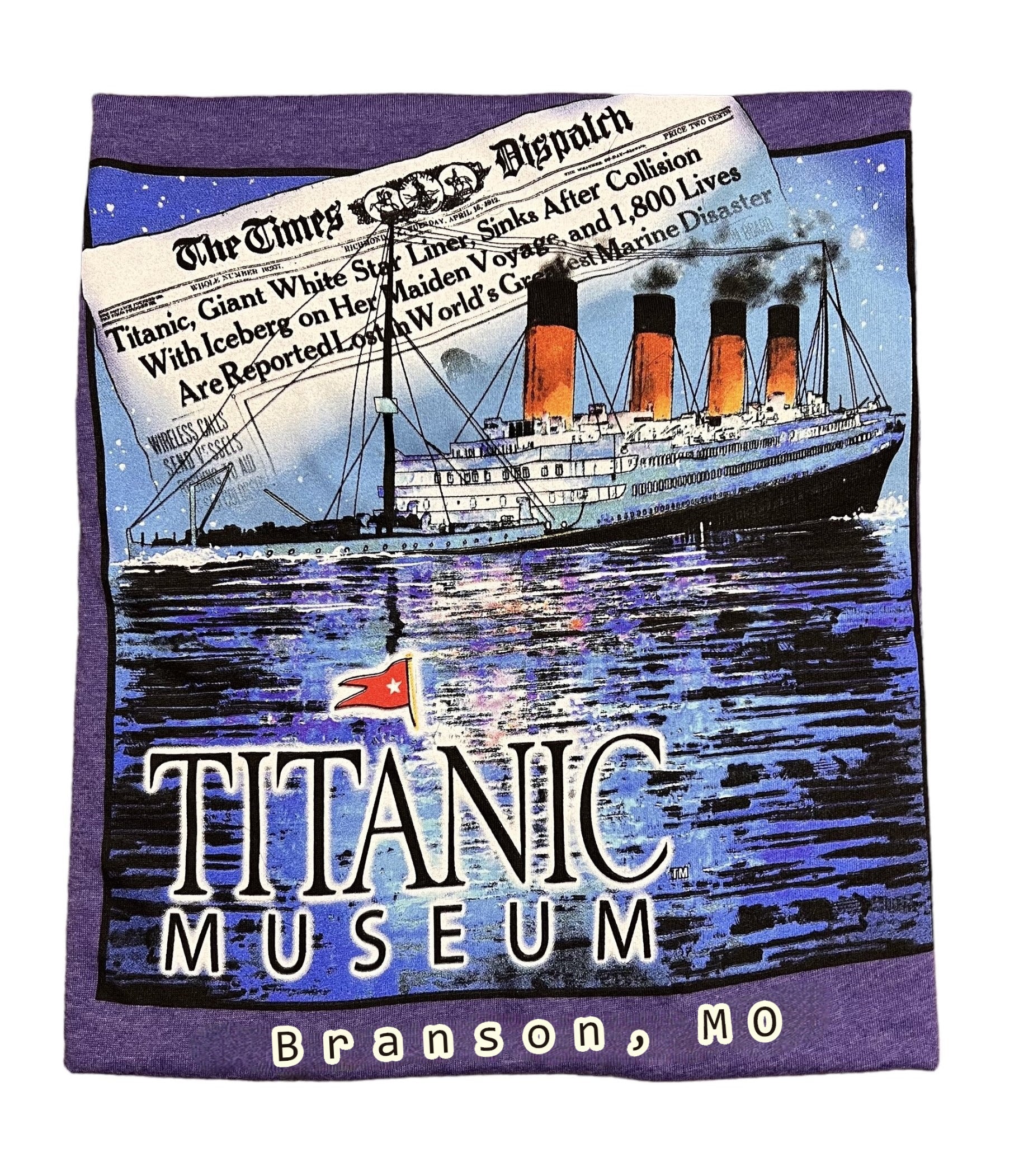 Available in purple or blue, the vibrant image is printed across the back, and a small TITANIC logo is printed on one side of the chest on front.