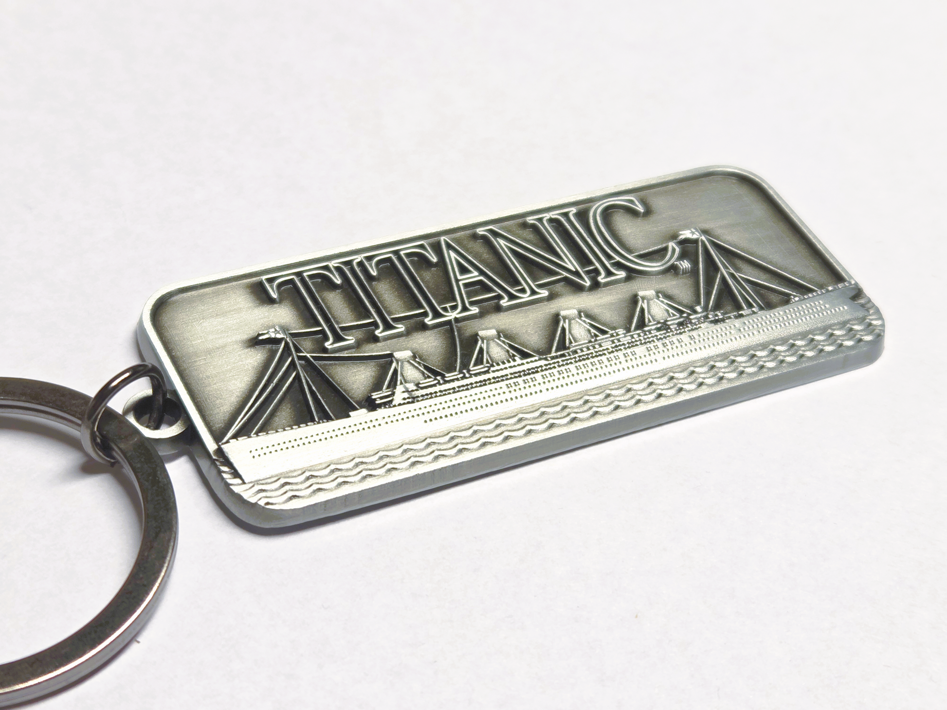 The Titanic is depicted as a raised design on this flat steely grey tag, with a touch of black antiquing to make the image pop!