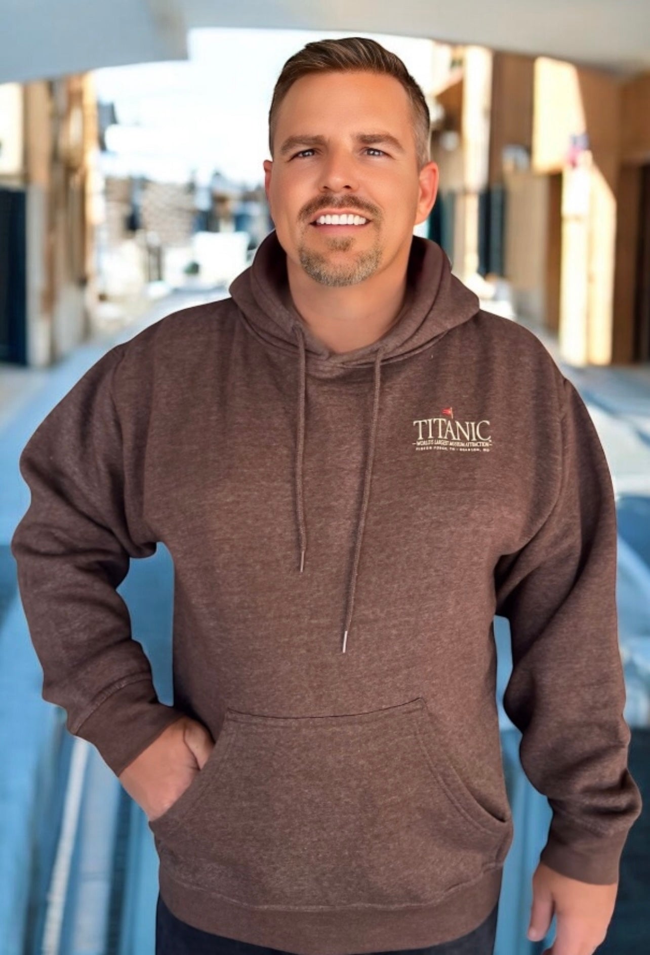 This classic hoodie with front kangaroo pocket and soft fleeced interior features a large print on the back that is brimming with antique nautical charm. The design depicts the Titanic imagined in an antique parchment poster style, surrounded by statistics about the ship. On the front, a small logo on the side of the chest says "TITANIC - World's Largest Museum Attraction - Pigeon Forge, TN - Branson, MO".