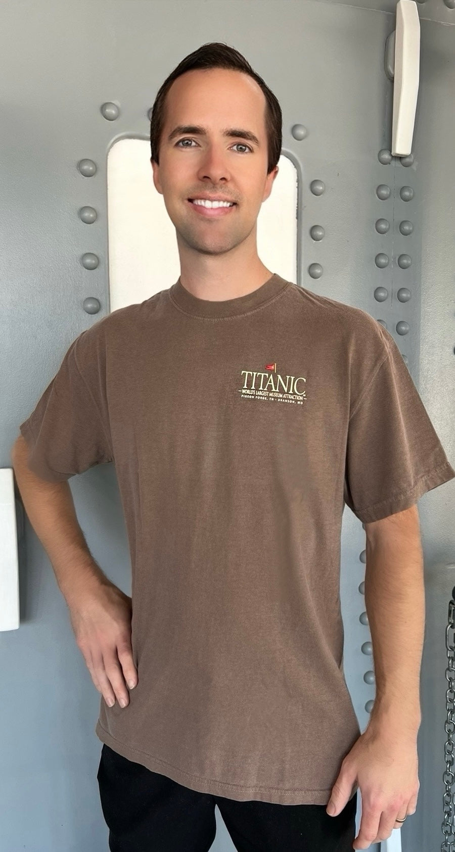 This Titanic T-shirt is brimming with antique nautical charm. The design on the back depicts the Titanic imagined in an antique parchment poster style, surrounded by statistics about the ship. On the front, a small logo is on the side of the chest that says "TITANIC - World's Largest Museum Attraction - Pigeon Forge, TN - Branson, MO".