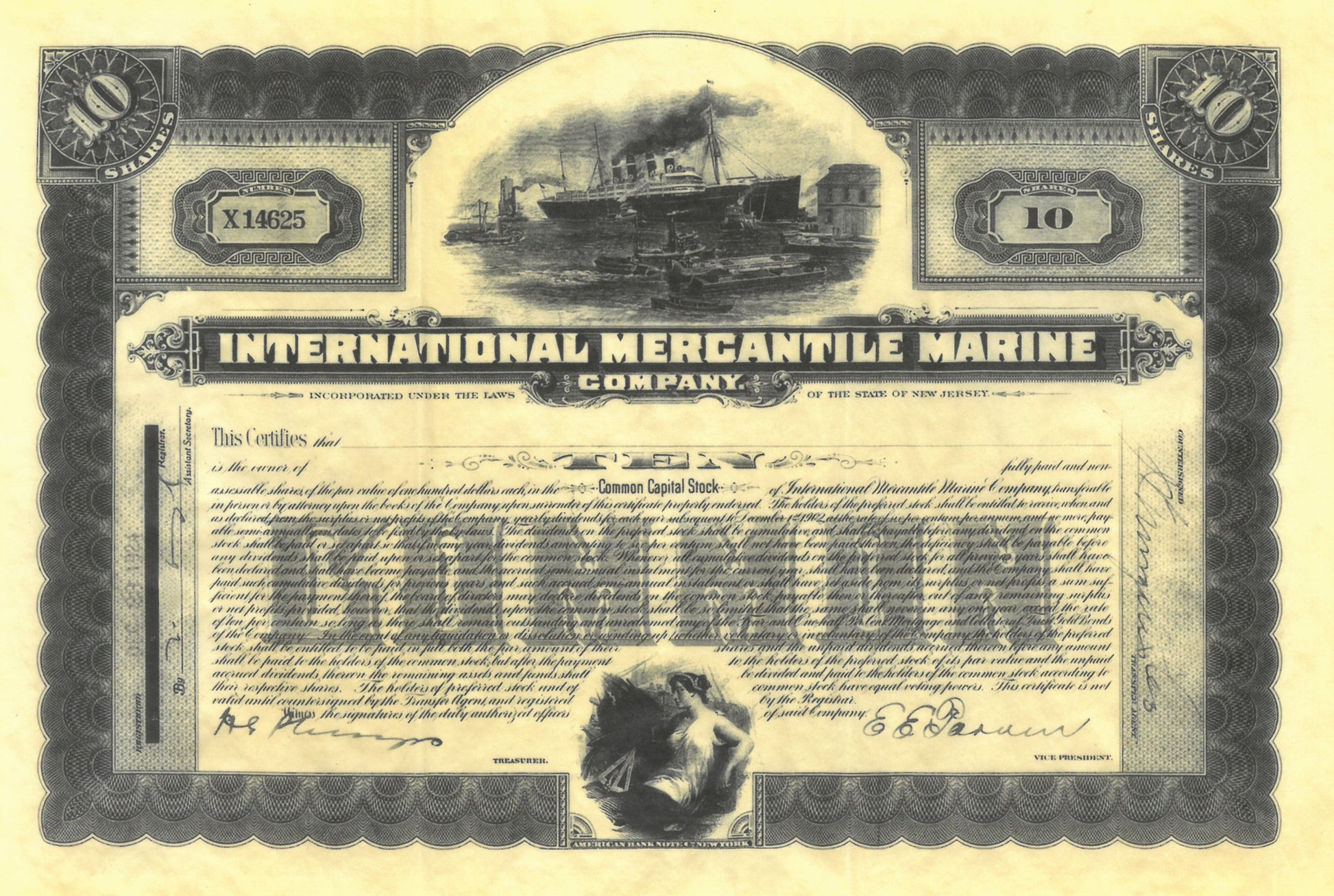 This replica Titanic Stock Certificate from the International Mercantile Marine Co. is a detailed reproduction of the stocks that would have been purchased with the expectations that the new RMS Titanic would have a long and profitable career.